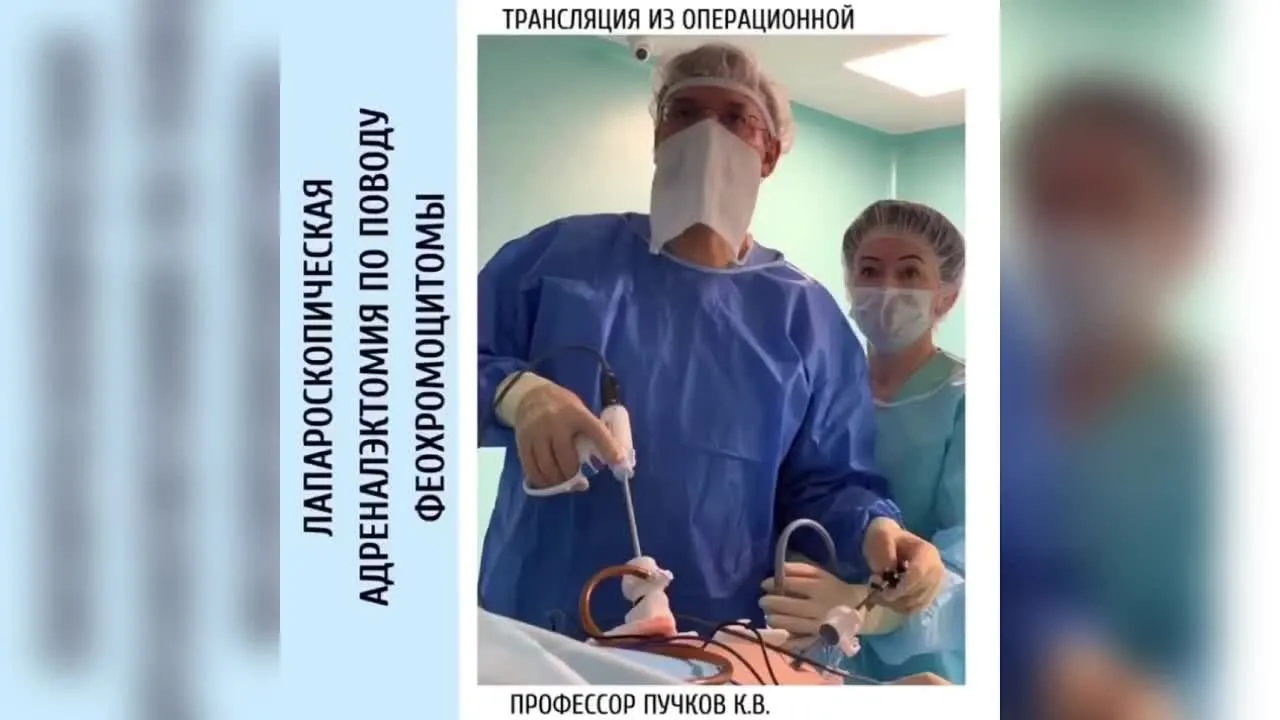 Лапароскопическая адреналэктомия по поводу феохромоцитомы. Оперирует профессор К. В. Пучков (2023 г).