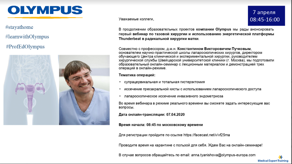 Друзья, я рад сообщить, что вчерашний Вебинар по тазовой хирургии и использованию энергетической платформы Thunderbeat в радикальной хирургии матки, организованный компанией Olympus, прошёл успешно