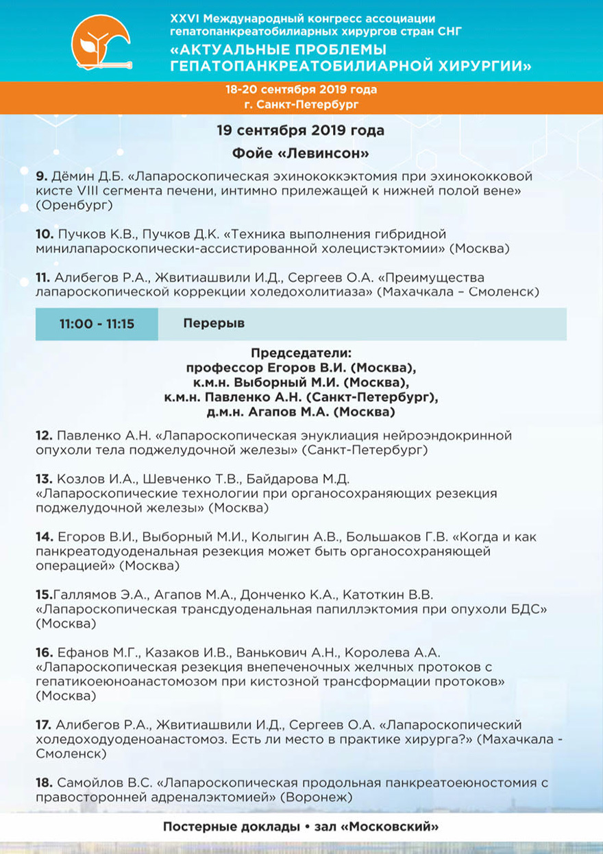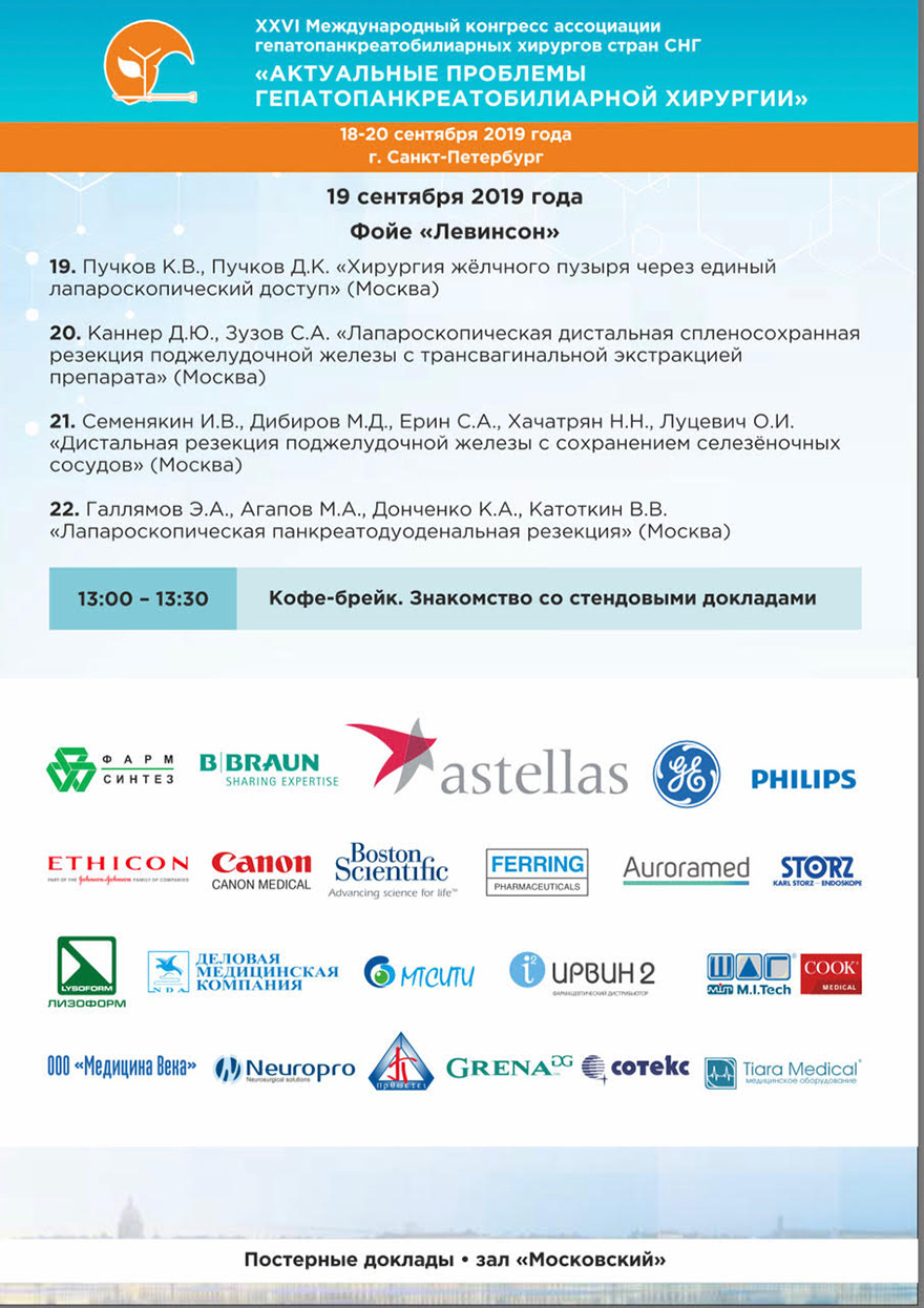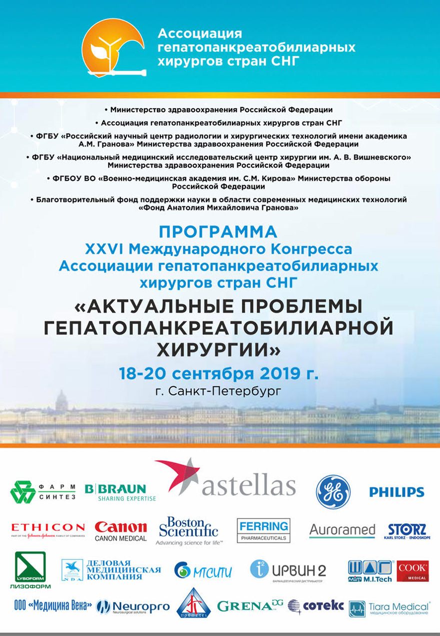 С 18 по 20 сентября 2019 года в г. Санкт-Петербург прошёл XXVI международный конгресс Ассоциации гепатобилиарных хирургов стран СНГ «Актуальные проблемы гепатопанкреатобилиарной хирургии».
