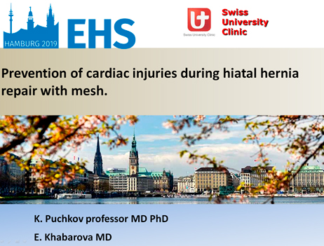 В секции, посвященной диафрагмальным грыжам, профессор К.В. Пучков и врач-хирург Е.В. Хабарова подготовили доклад «Prevention of cardiac injuries during hiatal hernia repair with mesh». Показаны методики, используемые при лечении грыж пищеводного отверстия диафрагмы больших размеров, разработанные в ходе 23-летнего опыта хирургического лечения гастро-эзофагеальной рефлюксной болезни, включающего более 2000 лапароскопических операций. Представлен авторский способ пластики пищеводного отверстия диафрагмы сетчатым имплантом, демонстрирующий в нашей клинической практике высокую безопасность и отсутствие рецидивов.