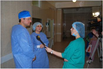 Профессор К.В. Пучков и заведующая отделением оперативной гинекологии профессор Алдангарова Г. А. дают интервью центральному телеканалу Республики Казахстан.
