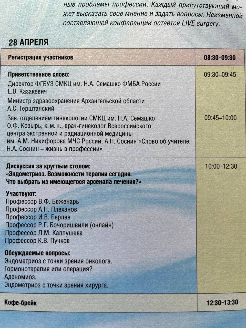 28-28 апреля 2019 г. Архангельске на базе ФГБУЗ им. Н. А. Семашко ФМБА РОССИИ прошла Всероссийская научно-практическая конференция "Эндоскопическая и высокотехнологичная оперативная гинекология", в рамках которой проф. К. В. Пучков провёл мастеркласс "Лапароскопическое иссечение очагов эндометриоза, резекция прямой кишки".