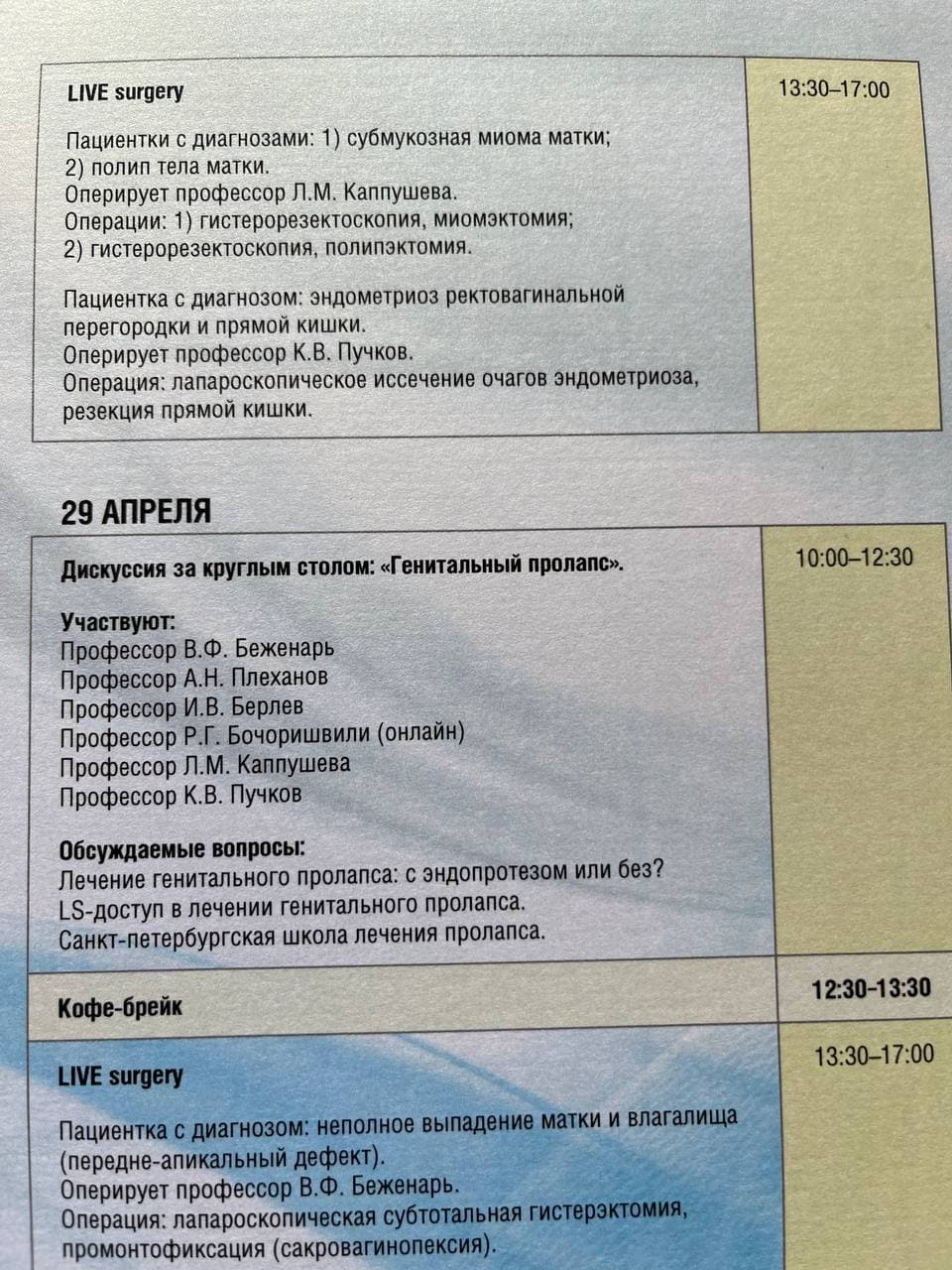 На конференции были продемонстрированы операции, которые транслировались в зал конференции по следующим темам- лапароскопия в онкологии, лапароскопия и вагинальный доступ в лечении генитального пролапса, лапароскопическим доступ в лечении инвазивного генитального эндометриоза.