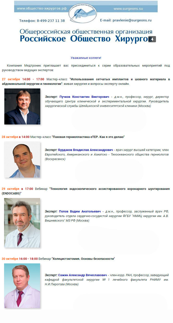 27 октября 2020 г. совместно с компанией Медтроник Ковидиен (Швейцария) профессор Пучков К. В. проведет мастер-класс из Швейцарской университетской клиники онлайн на Россию и ближнее зарубежье. Трансляция пройдет в рамках серии вебинаров и мастер-классов под руководством ведущих экспертов.