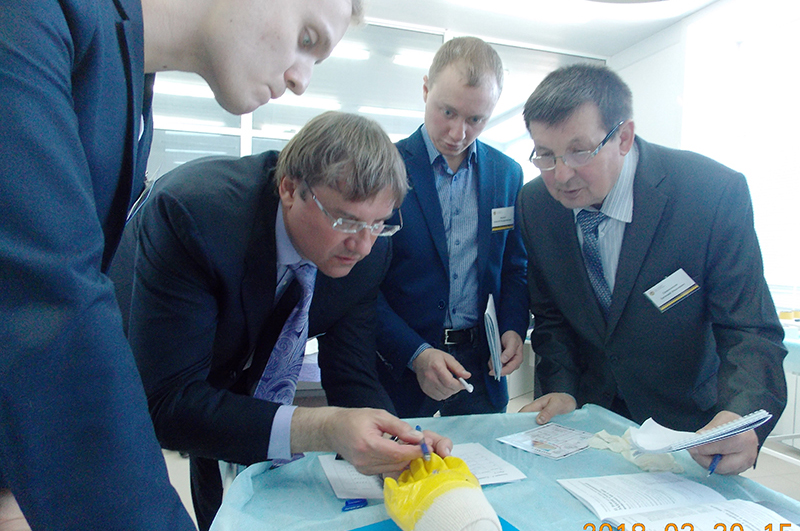 Победила в первом конкурсе студентка из Воронежского ГМУ им. Н.Н. Бурденко - Наталия Гулова. Половина претендентов практически не справилась с заданием «Аппендэктомия», - продолжает Александр Анатольевич. - Либо соревнующиеся не успевали полностью пересечь палец наполненной водой резиновой перчатки, либо пересекали, но с повреждением перчатки, что было видно по излившейся воде. Лучший результат показали ярославцы - 3 минуты 24 секунды. Их работа отличалась герметичностью, перчатка осталась сухой. Удалённый участок пальца перчатки также не пропускал воду - так качественно были завязаны узлы.