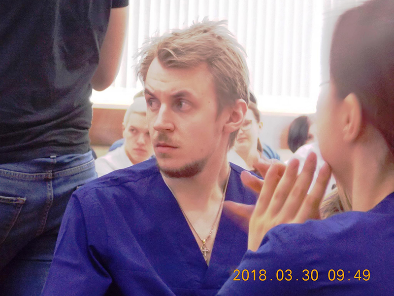Участники соревнований собрались перед учебной комнатой с четырьмя американскими тренажёрами 3Dmed. Многие обращали внимание на удобный столик с инструментами на треноге, рядом с которым совещались волгоградцы Марина Яковенко, Денис Семёнов и Ян Юйчуань.
