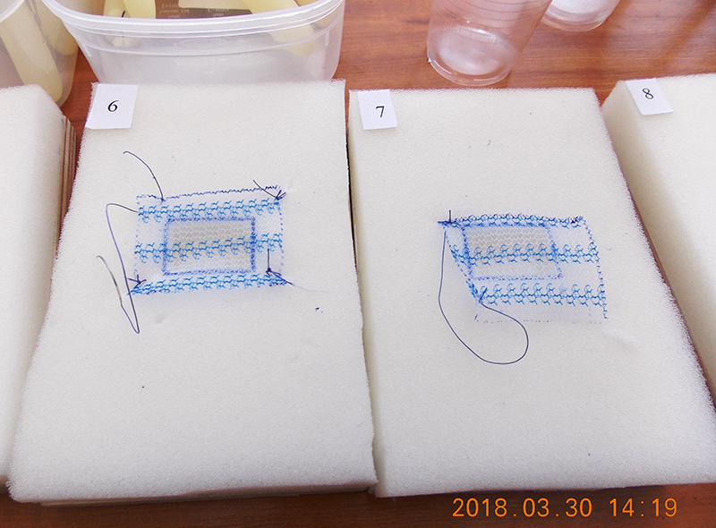 На выполнение задания «Герниопластика» отводилось 10 минут. За это время требовалось наложить по одному шву на четыре угла сетчатого эндопротеза 4×5 см, закрыв дефект в губке 2×3 см. И здесь половина команд не уложилась во времени и не получила ни одного балла. Лишь команда № 5 ровно расположила сетку, аккуратно зафиксировала её так, что она не парусила и не отставала от поролона. Так студентка 2-го курса Виктория Джуганова положила в копилку воронежцев максимум - 24 балла!