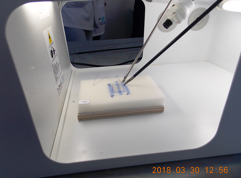 В первом задании первого этапа «Вязание интракорпоральных узлов» требовалось за 1 минуту сформировать с помощью лапароскопических инструментов «косичку» из нити. Первый узел формировался до начала отсчета времени, а длина «косички» оценивалась от начала до первого дефекта. Каждый её миллиметр соответствовал 0,5 балла.