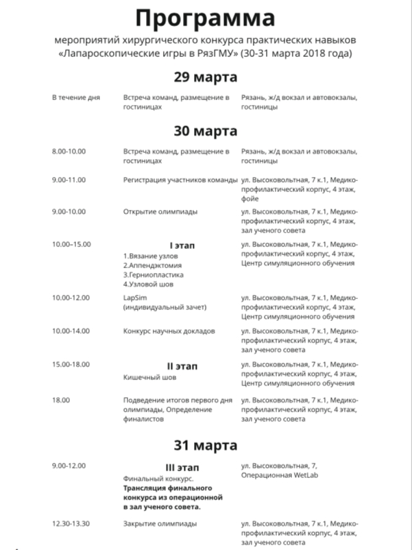 После этого и зародилась мысль проводить на базе Рязанского ГМУ им. акад. И.П. Павлова соревнования нового формата – Лапароскопические игры. В процессе организации соревнований, которые курировал ректор, для учебных классов и вивария закупили современное оборудование. Во время широкого внутривузовского отбора в рядах сборной появились молодые хирургические таланты.